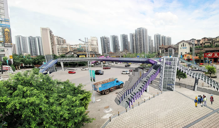 建設(shè)內(nèi)容及規(guī)模:項(xiàng)目包含人行過街天橋、交叉口渠化改造、道路車行道拓寬等工程;天橋主跨長40m,總面積933平方米,包含8道梯道和4部垂直電梯,是重慶市目前配備垂直升降電梯數(shù)量最多的無障礙通行人行天橋。