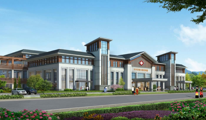 大方縣為彝族聚居地,多采用”土掌房“,由于山地地形有限,沿山而建時(shí)為了充分利用屋頂空間,采用了平屋頂形式作為曬場及室外空間。慈善醫(yī)院造型設(shè)計(jì)中刻意弱化了綜合醫(yī)院的大體量,突出了多個(gè)院落形成安定感,同時(shí)強(qiáng)調(diào)了平直線條的延伸感,與坡屋頂形成層次分明的造型感受。