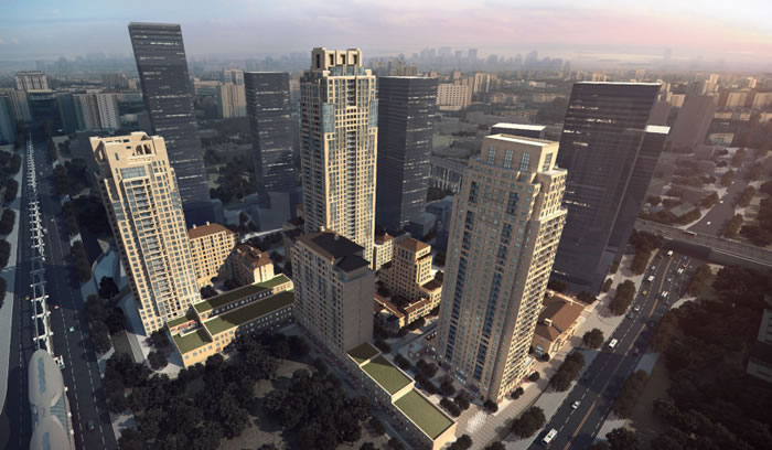 采用點(diǎn)式單體、分散布局,對(duì)高層塔樓的形態(tài)和高度進(jìn)行精心設(shè)計(jì),不同組團(tuán)的高度以100米,150米,180米三個(gè)不同層次的高度變化。