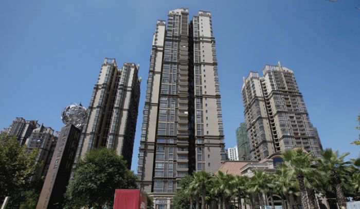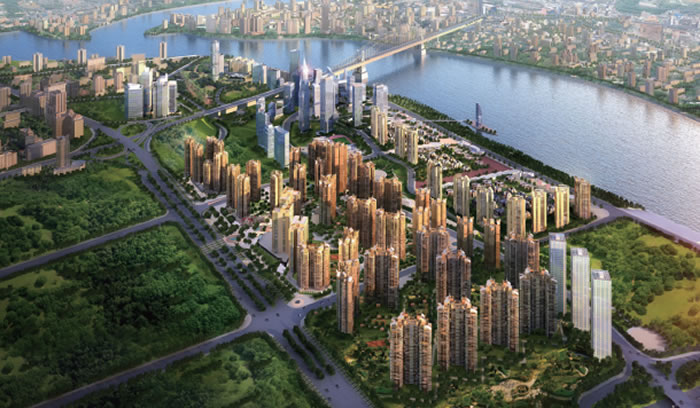 本項目用地被兩條市政路和一條綠化景觀帶分隔為五個組團,用地內高差變化較大。以點式高層和雙拼式高層住宅圍合成五個大規模庭園,高層塔樓均布置在用地邊角,最大限度地退后道路,并在保證滿足容積率的同時最大限度地拉開建筑間距,避免對視干擾。以點式為主的布置,形成多方向視線通道,并利用單體高度優勢,實現中心綠軸景觀及溝谷公園和庭院的景觀資源的共享。住宅主體大部分南北向布置,五個組團庭園空間各自獨立,形成優美的組團內部環境。為降低四邊臨路所帶來的干擾,緩合各單體對峙的局促感,所有單體均與用地成一定夾角,且互相錯位布置,并盡可能向西側溝谷公園和中心綠軸開放視野,既充分利用景觀資源,又可以形成超大建筑間距。