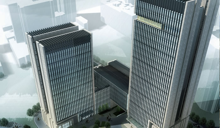 本項目是集車庫、超市、辦公、酒店、餐飲、運動場所為一體的綜合性辦公樓。整個建筑是由兩個塔樓組成,兩個塔樓相互獨立、互不干擾,既滿足功能上獨立管理的要求,又能通過裙房將兩棟塔樓有機聯系在一起,且兩塔之間退讓的城市廣場將辦公樓對城市的壓迫和道路對辦公樓的噪音影響減少到最低;并且兩棟塔樓錯開“L”形布置,既減少了視線干擾,同時將2棟塔樓對彼此之間的壓迫感減至最低。