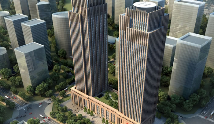 方案采用兩棟超高層建筑結合布局的方式,形成具有雕塑感與標識性的簡潔辦公群體,建筑采用“金色號外”的設計母題,采用暖灰的色調,既與報業集團的社會認知相吻合,又以藝術形象的完美體現,昭示集團的蓬勃發展。雙塔樓以現代風格設計,強調簡潔的體量組合和流暢的線條及建筑的整體性,并突出現代的材料和現代的構造技術,同時注重建筑的整體空間關系;根據總體布置、建筑規模、平面形式、使用功能,采用現代設計表現形式,以滿足不同方向視覺均較豐富、完整,同城市環境具有良好的視覺關系。立面上采用暖灰色石材和玻璃幕墻的外立面處理手法,豎向線條賦予建筑典雅大氣的整體效果。
