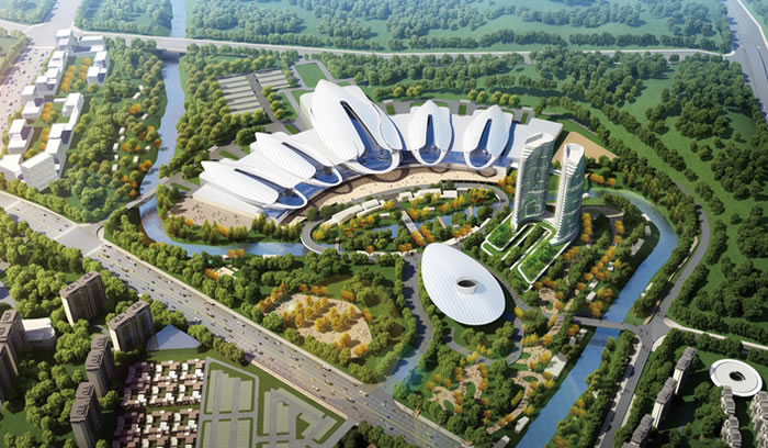 會展核心區分三棟單體建筑組成,分別為會展中心,會議中心,辦公酒店商業綜合體; 其中會展中心分為地面會展層,地下停車層,夾層辦公管理層,以及親水商業區。會展中心主體部分由5個大 型會展中心,一個大型綜合前廳組成,其中最大的展廳為100Mx200M,采用桁架結構體系,最大跨度為50M,建 筑高度為35M,可根據各種需求靈活布展;其他展廳為60Mx120M,最大跨度為30M,建筑高度為25M。會展中心 屋面為銀白色金屬屋面,前廳玻璃幕墻為桁架體系玻璃幕墻系統,玻璃分塊尺寸接近4Mx2M。 會議中由公共大廳,一個2000M2左右的大型報告廳,一個700M2左右的重型會議廳及若干中小型會議室組 成;會議中心采用鋼結構桁架體系,底層架空,建筑高度為25M;由金屬板及玻璃幕墻包覆。