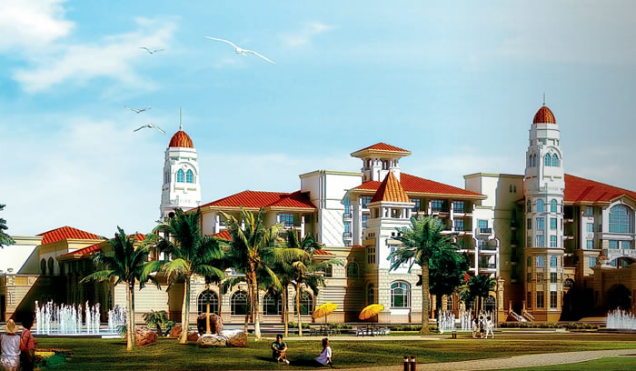 構(gòu)圖方式,并在相互協(xié)調(diào)上,運(yùn)用材料及立面設(shè)計(jì)元素上加以強(qiáng)調(diào)。設(shè)計(jì)形式采用歐陸,特別是地中海地區(qū)常用的拱廊、拱形窗、百葉窗、腰線、檐口線、突出建筑的小尖塔、小亭、花架、大坡頂?shù)冉ㄖ⒚娉S脴?gòu)件,在節(jié)點(diǎn)上、比例尺度上、序列上、功能上、構(gòu)成上加以推敲、研究及應(yīng)用。如入口的立面處理手法,在有強(qiáng)烈韻律感的連續(xù)多個(gè)拱形窗的基礎(chǔ)上,以簡(jiǎn)潔大跨度的入口門(mén)廊節(jié)點(diǎn)予以突破,從而加強(qiáng)了入口設(shè)計(jì)本身的重要性,襯托了整個(gè)建筑立面的設(shè)計(jì)中心部位。